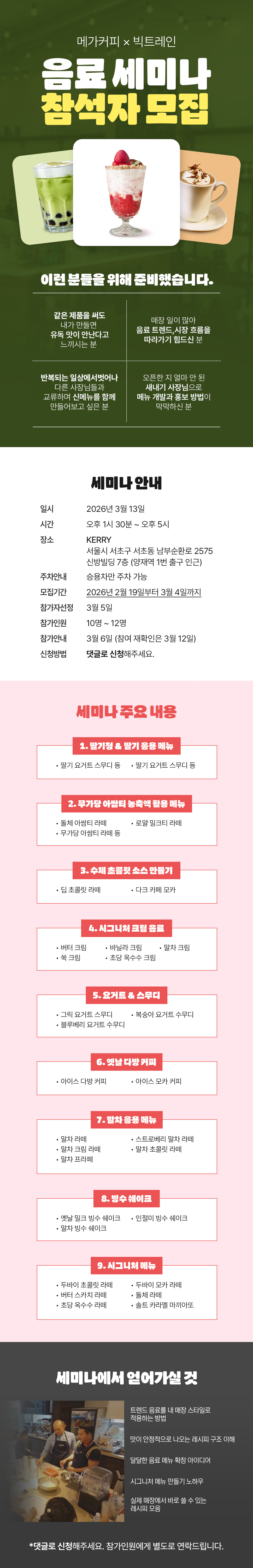 안녕하세요 세미나 참석 신청합니다~! 음료메뉴가 얼마 없어서 늘리고 싶은 와중에 좋은 기회인것 같아서 신청해봅니다~! 2026-02-19 18:45:51
