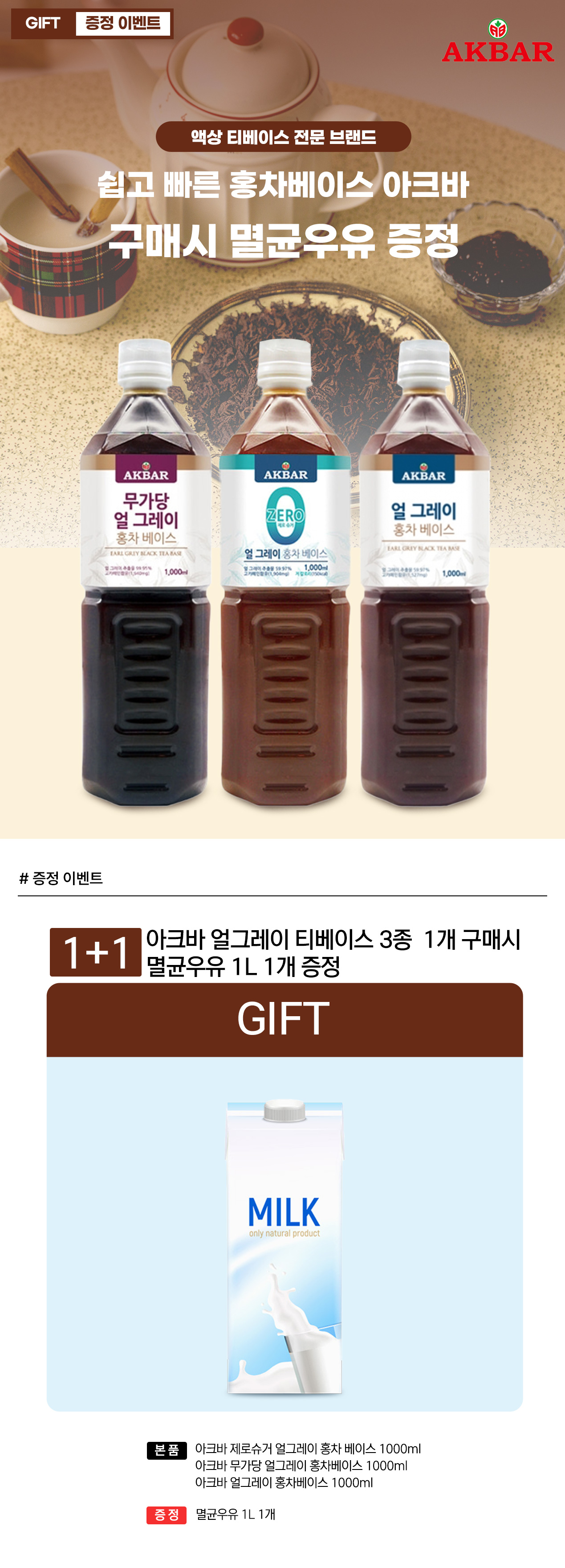 아크바 제로슈거 얼그레이 홍차 베이스 1000ml + 멸균우유 1L 증정